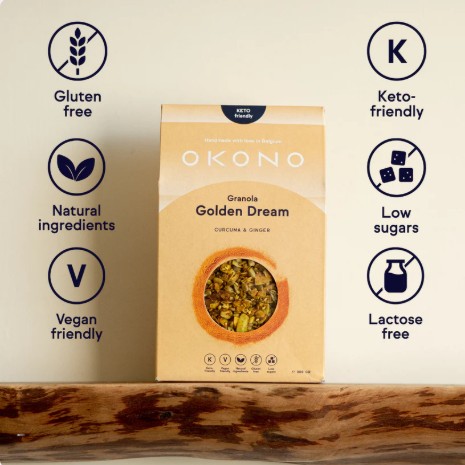Onze Golden Dream Granola (300g) combineert de natuurlijke kracht van curcumine met warme kruiden zoals gember en kaneel, wat resulteert in een mix die even rustgevend als smaakvol is. Elke lepel biedt een aangename crunch en een milde pittigheid die de zintuigen prikkelt.