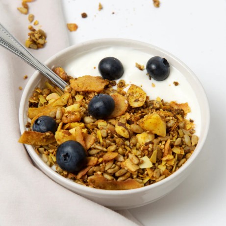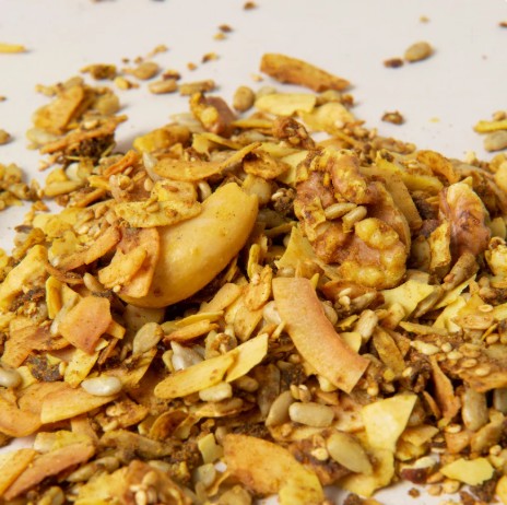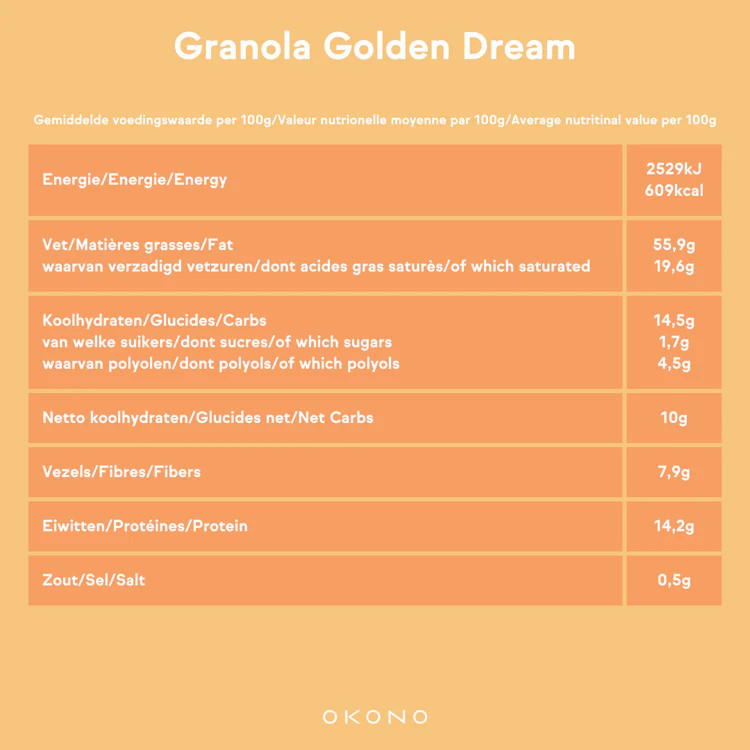 Zonnebloempitten, Kokosvlokken, Paranoten, Sesamzaad, Amandelschaafsel, Kokosnootolie, Zoetstof: Erythritol, Lijnzaad, Pinda's, Walnoten, Kurkuma (1,5%), Gemberpoeder (0,9%), Kaneel, Zeezout.